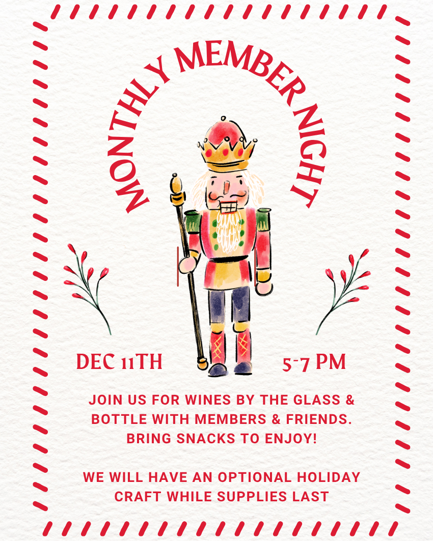 This month we will have a little holiday craft while supplies last. Wines will be available to purchase by the glass or bottle with your member discount. Bring your friends and enjoy a cozy evening relaxing with us!